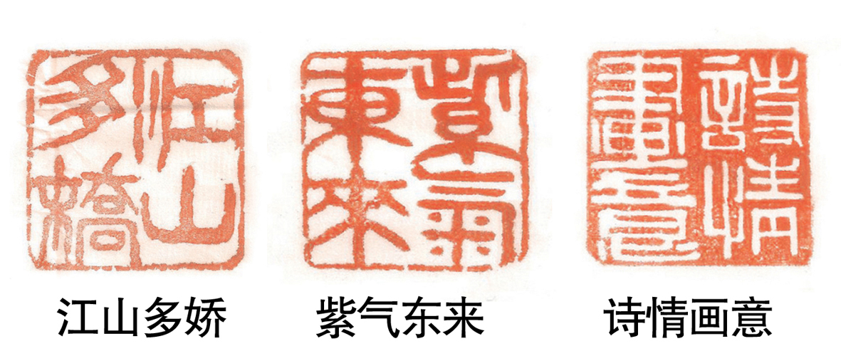 陳則生還喜愛篆刻,摹習(xí)臨刻古璽漢印,集眾家之所長。在京工作期間,拜訪名師,技藝日漸升華,形成了自己的篆刻藝術(shù)風(fēng)格。他將各種基本手法靈活地加以運(yùn)用,融會(huì)貫通地變換各種運(yùn)刀手法。從“江山多嬌”“紫氣東來”“登高望遠(yuǎn)”“學(xué)無止境”“詩情畫意”等作品來看,刀法流暢,靈心獨(dú)運(yùn),厚重而不滯,雄渾蒼勁結(jié)字雅正,疏密有致,端莊穩(wěn)重,古樸厚郁,令人驚嘆!