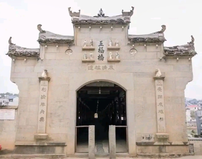 縣城驅車半小時即達渭田鎮,穿過街道,沿河而上百余米,歷史悠久的五福橋,尤如青龍汲水,橫臥在波光粼粼的河流之上。據《松溪縣志》記載:五福橋始建于明永樂九年(1411年),明正統十二年重建,清咸豐八年(1858年)毀于兵火,光緒二十九年(1903年)重建,1952年局部水毀,1953年重修,1981年列入縣級文物保護單位,1983年重建,現為省級文物保護單位。