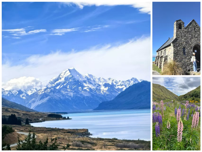 南島行的最后一天,車子沿著蒂卡波湖緩緩前行,離別的情緒輕輕漫上心頭。車窗外那片獨(dú)有的奶藍(lán)色湖水,安靜得不像話,卻在第一眼就撞進(jìn)心底。岸邊的魯冰花早已過(guò)了盛放時(shí)節(jié),只剩幾縷淡淡的色彩,散落在微黃的草坡上。風(fēng)掠過(guò)耳畔,那首熟悉的旋律忽然輕輕響起:“夜夜想起媽媽的話,閃閃淚光魯冰花……”一瞬間,異鄉(xiāng)的風(fēng)也變得柔軟,連呼吸都裹著一絲想家的溫柔。