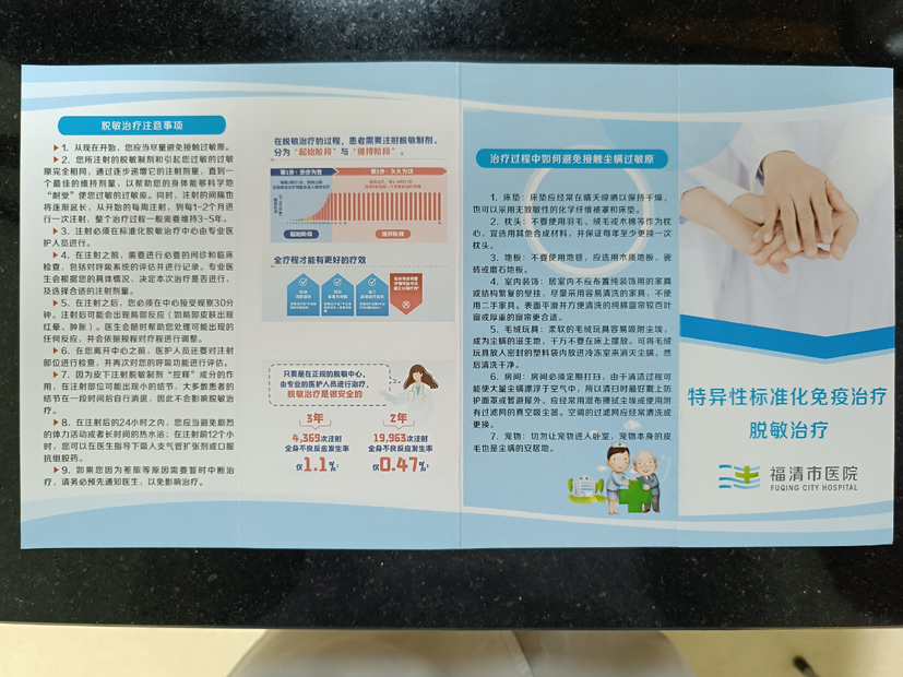 福清市醫院耳鼻咽喉科變態反應室建于2008年至今已14年,開展了舌下免疫治療。在這基礎上,2021年以培育建科的形式成立了“過敏反應中心”,以耳鼻咽喉變態反應、呼吸變態反應、皮膚變態反應、小兒變態反應等多個亞專業學科進行聯合診療。同年被列為“中國過敏學科優秀核心團隊建設單位”,并加入了以中華預防醫學會過敏病預防與控制專業委員會為指導單位發起的“福建省兒童過敏性疾病專科聯盟”,是福州市醫學會變態反應學分會的掛靠單位。現科室建有獨立實驗室,配備國際“金標準”的賽默飛Phadia全自動體外過敏原檢測系統、皮膚點刺體內檢測、肺功能、心電監測儀、電子鼻-鼻咽喉鏡等先進儀器設備,進行標準化特異性免疫治療、室內外過敏原環境監測等.過敏反應中心開展的皮下特異性免疫治療(即脫敏治療)是世界衛生組織認可的唯一可能改變過敏性疾病自然進程的對因治療方法,這種療法還能預防新發的過敏原,對于兒童而言還可以預防過敏性鼻炎進展為過敏性哮喘,是廣大過敏性疾病患者的福音。